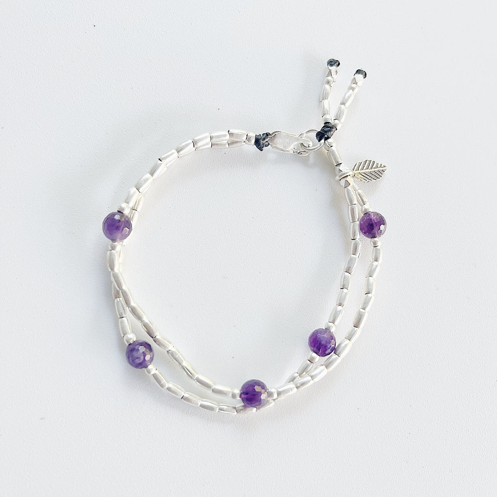 Beautiful Hill Tribe Silver double strand bracelet with floating Amethyst gemstones & leaf charms.